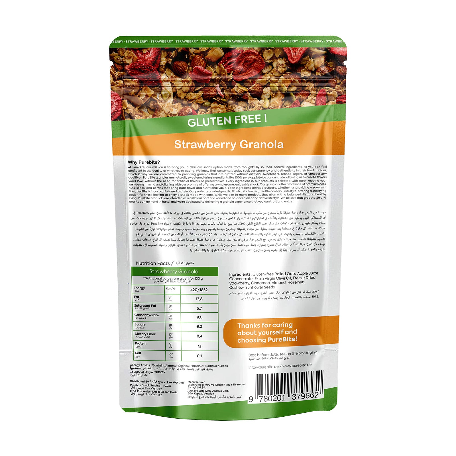 At Purebite, we believe that the best flavors come from nature. That’s why we created Strawberry Granola, a perfectly balanced blend of crunchy oats, real strawberries, and natural sweetness from 100% pure apple juice. Every spoonful offers a delicious combination of fresh fruit flavors and a satisfying crunch, making it an ideal breakfast or snack for anyone who values taste and nutrition.