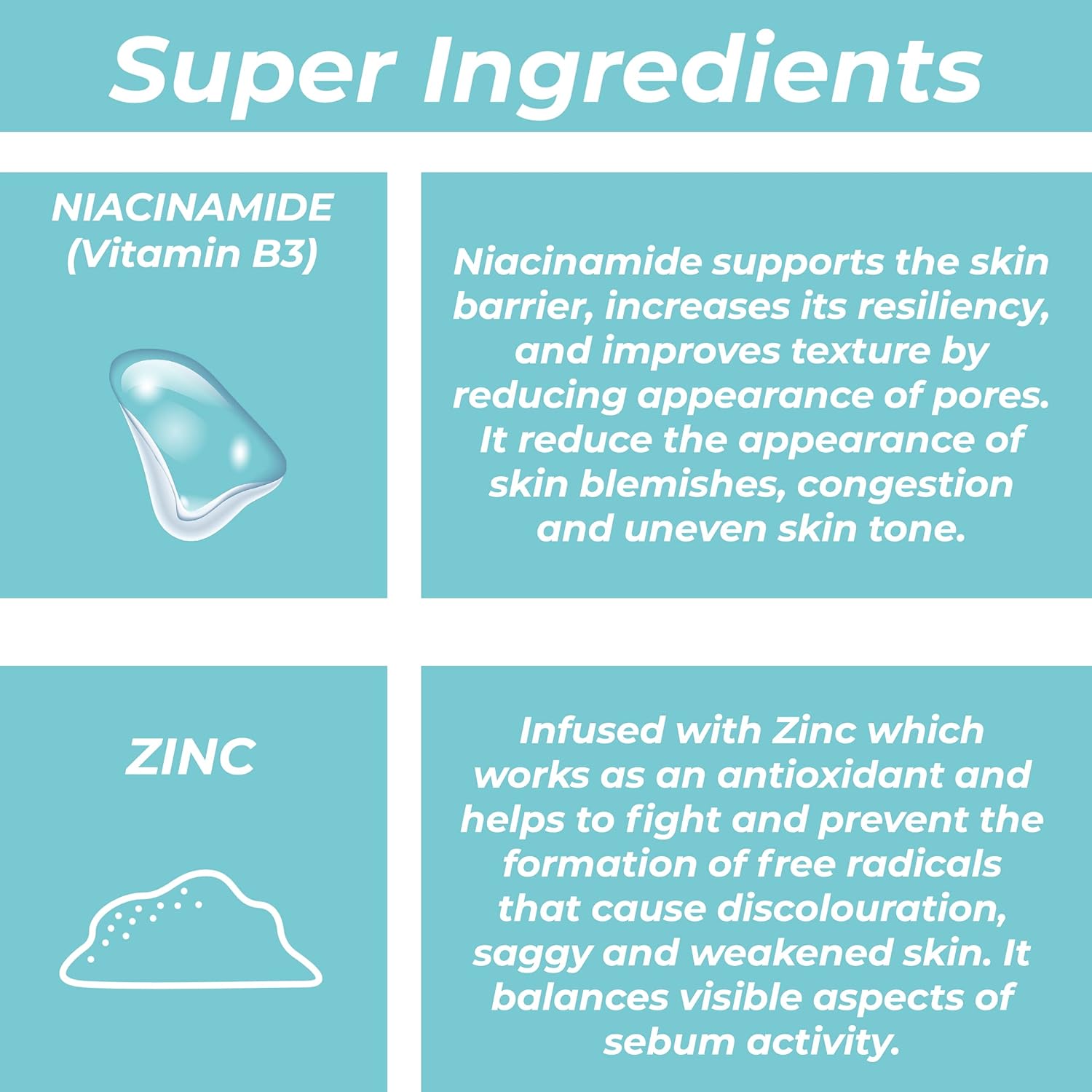 Blemish Buster: The combined strength of Niacinamide and Zinc actively fights against breakouts, reducing their frequency and severity.