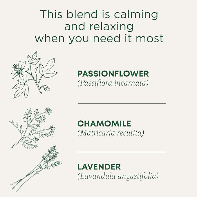 Organic passionflower herb, Organic chamomile flower, Organic lavender flower, Organic catnip herb, Organic rosemary leaf, Organic peppermint leaf, Organic spearmint leaf, Organic licorice root, Organic stevia leaf